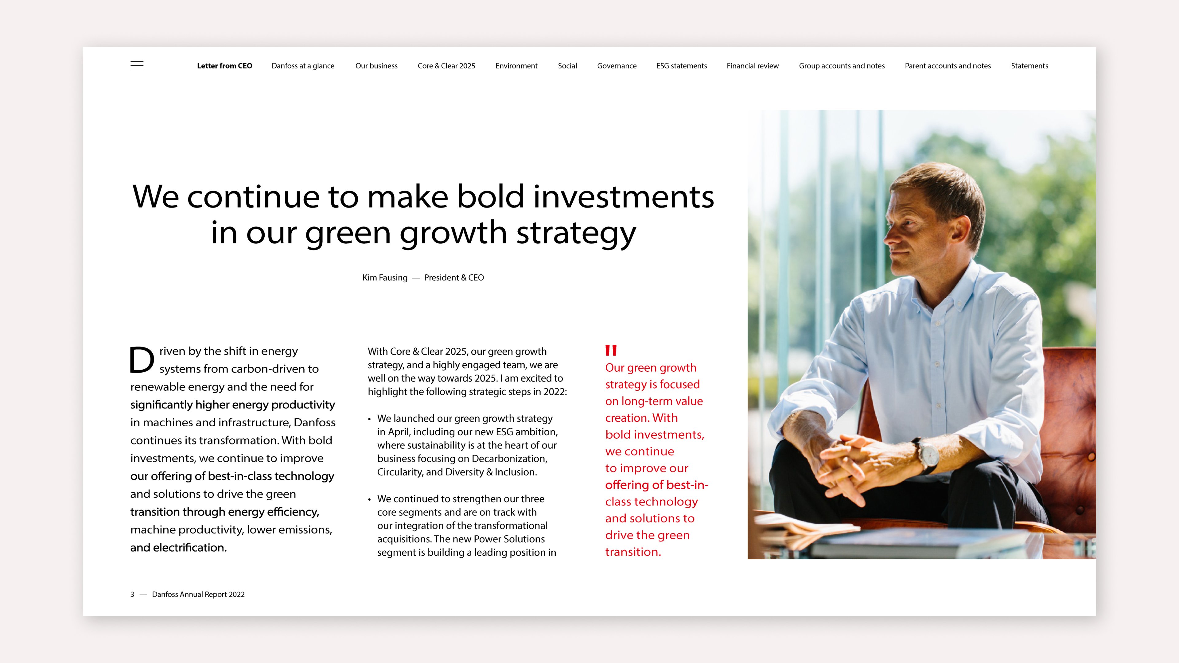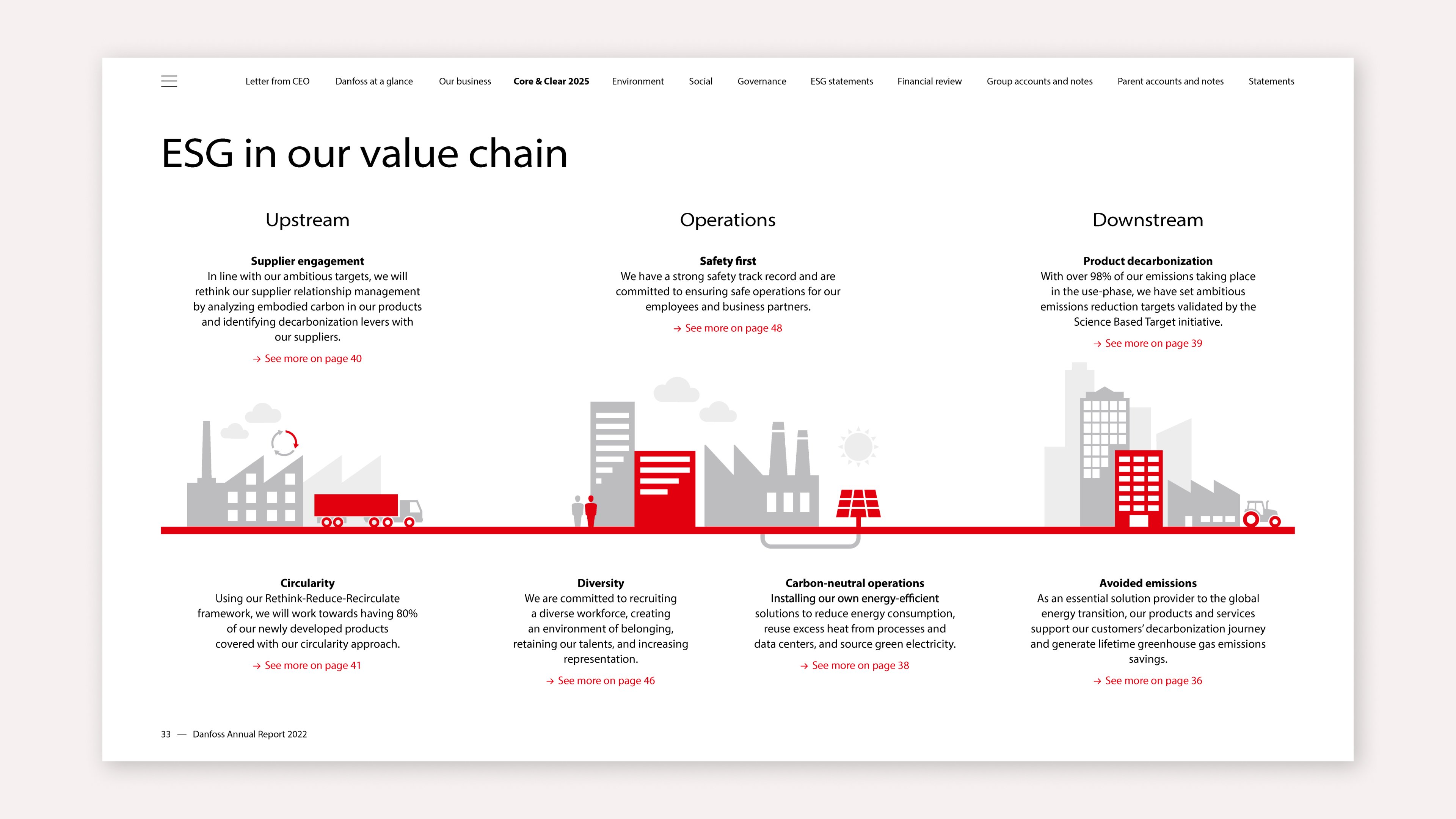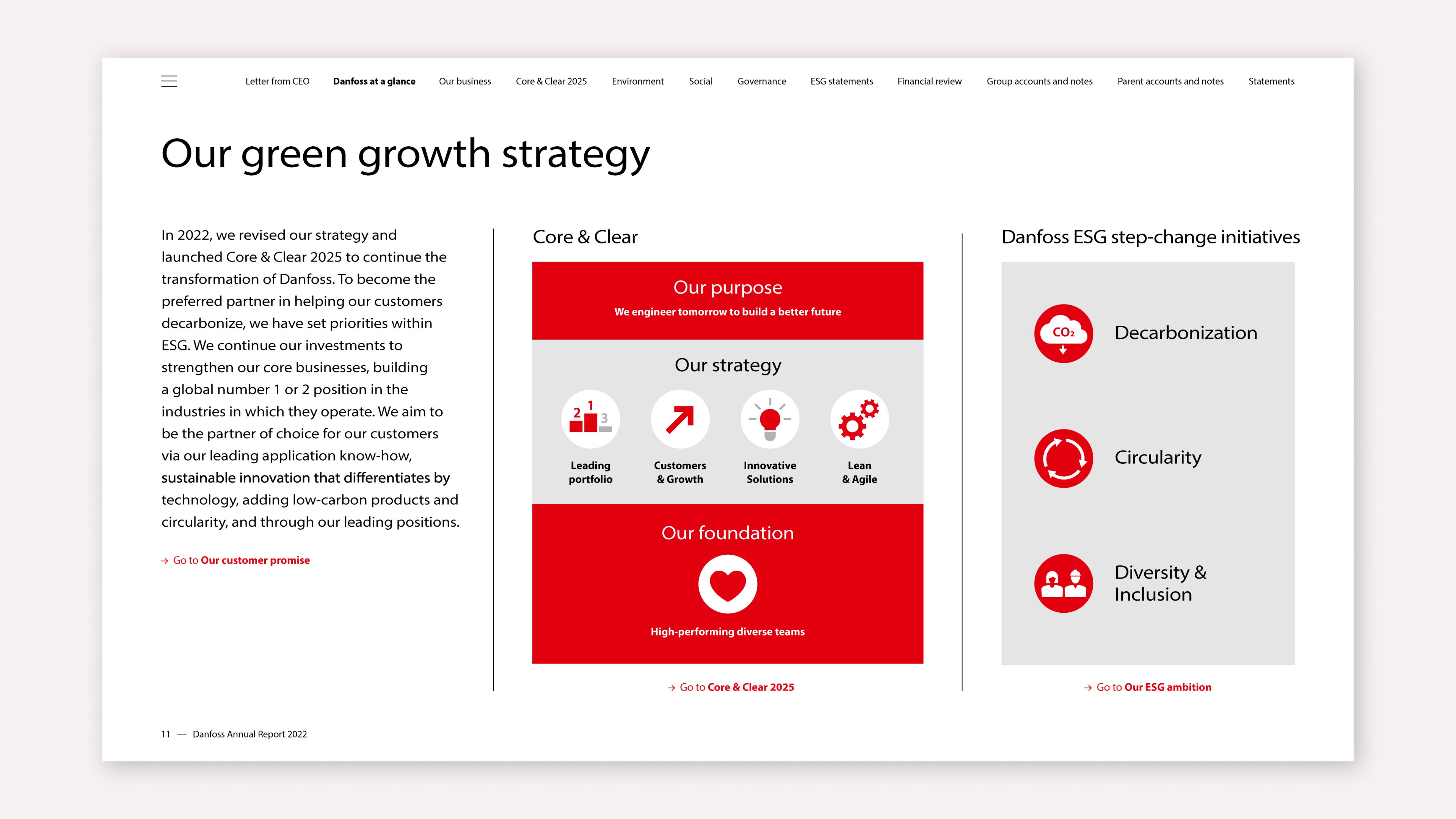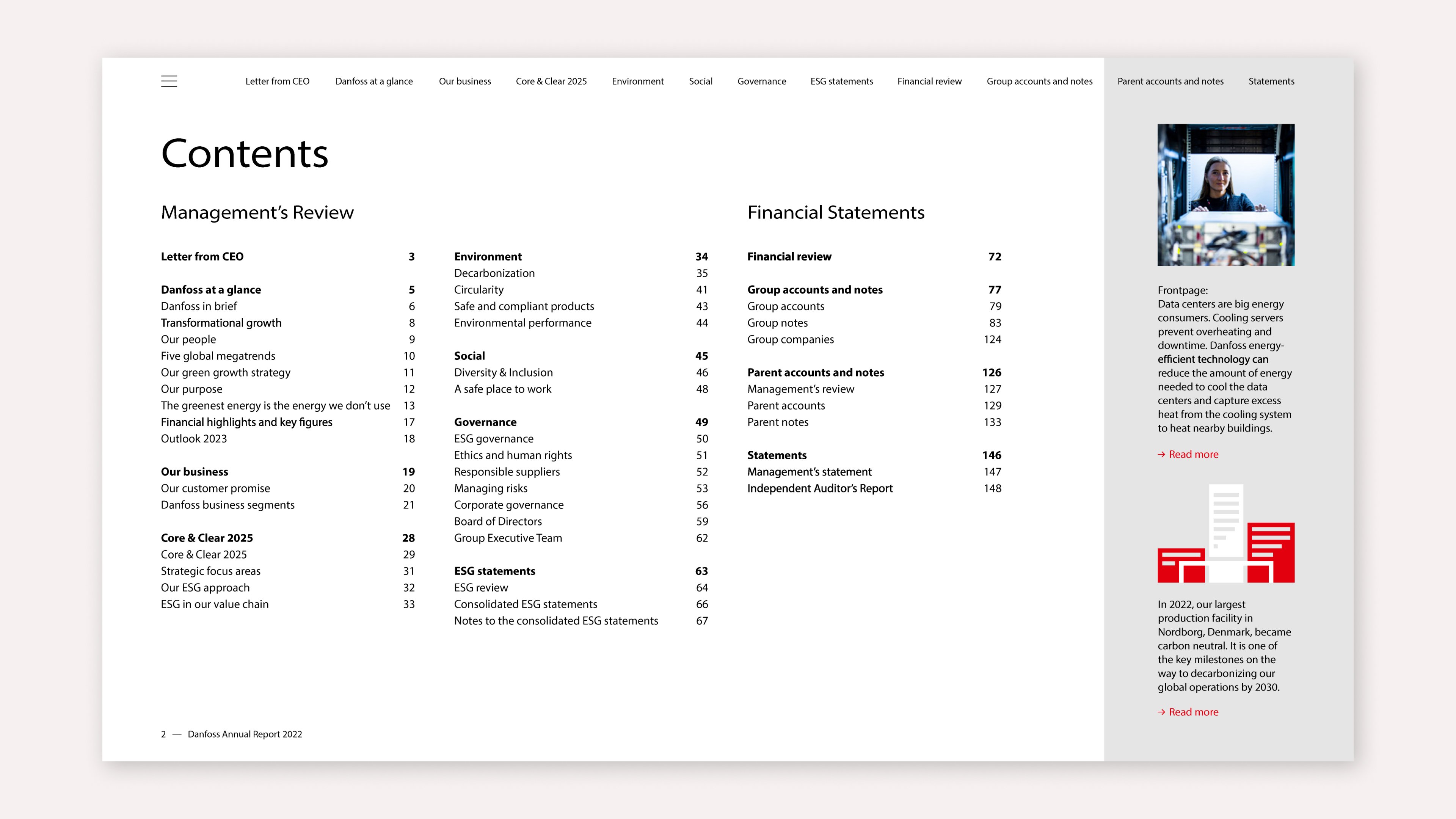 Danfoss excels in making a clear ESG structure the centrepiece of their integrated report. They do so by communicating about making investments with long-term value creation. The commitment to drive the green transition is a priority for the company as a whole. ESG is evident in their value chain and the cases Danfoss highlighted throughout the report.